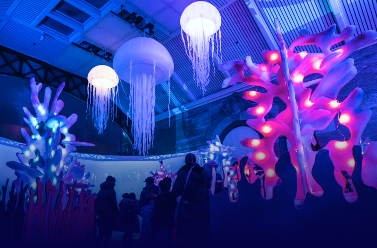 The undersea world is brought to life with NEW friendly puppets, interactive floor projections, ocean-themed interactive light panels, and a jellyfish celebration in lights.